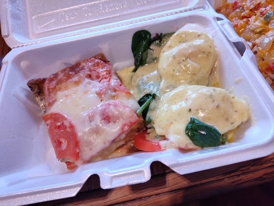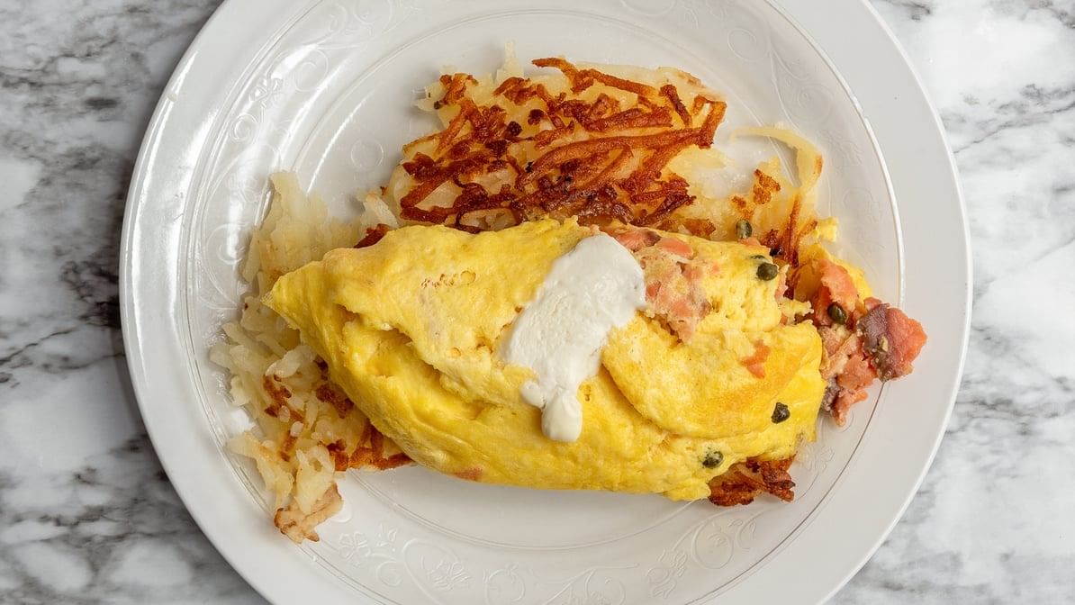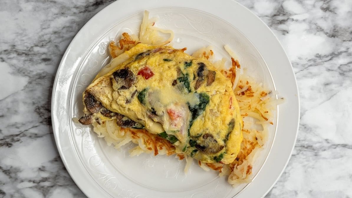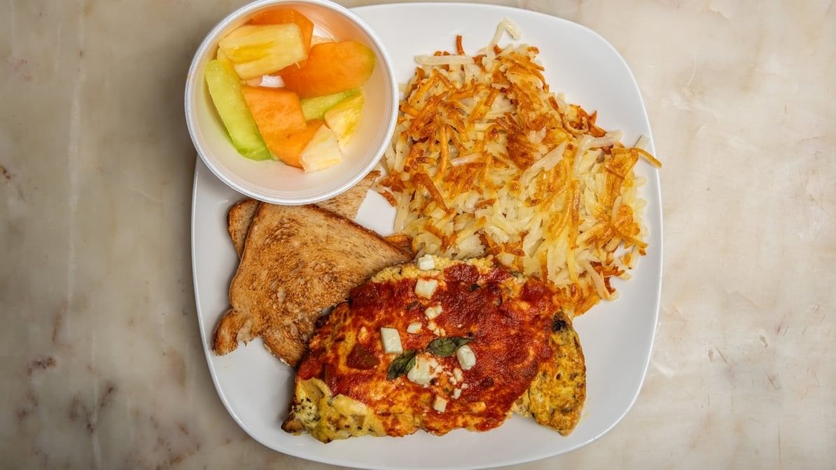 Sun-dried tomatoes, onions, basil, mushrooms, and feta cheese with ranchero and hollandaise sauce, served with tomato slice or hashbrowns