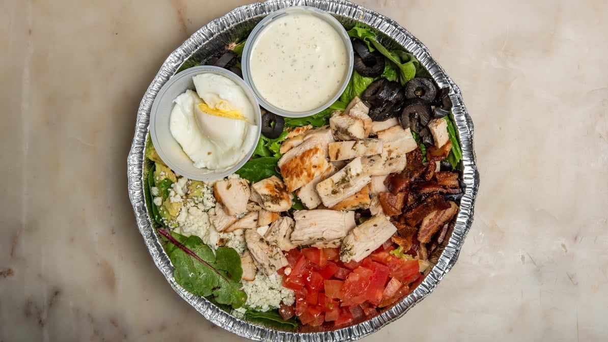 Chopped romaine with egg chicken, bleu cheese crumbles, avocado black olives, tomatoes, bacon