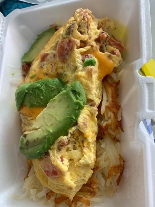 Egg whites, black olives tomatoes spinach light cheddar topped with avocado, pico de gallo served with tomato slices