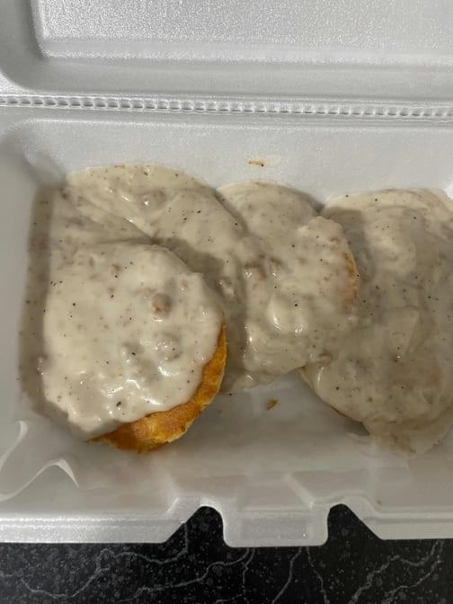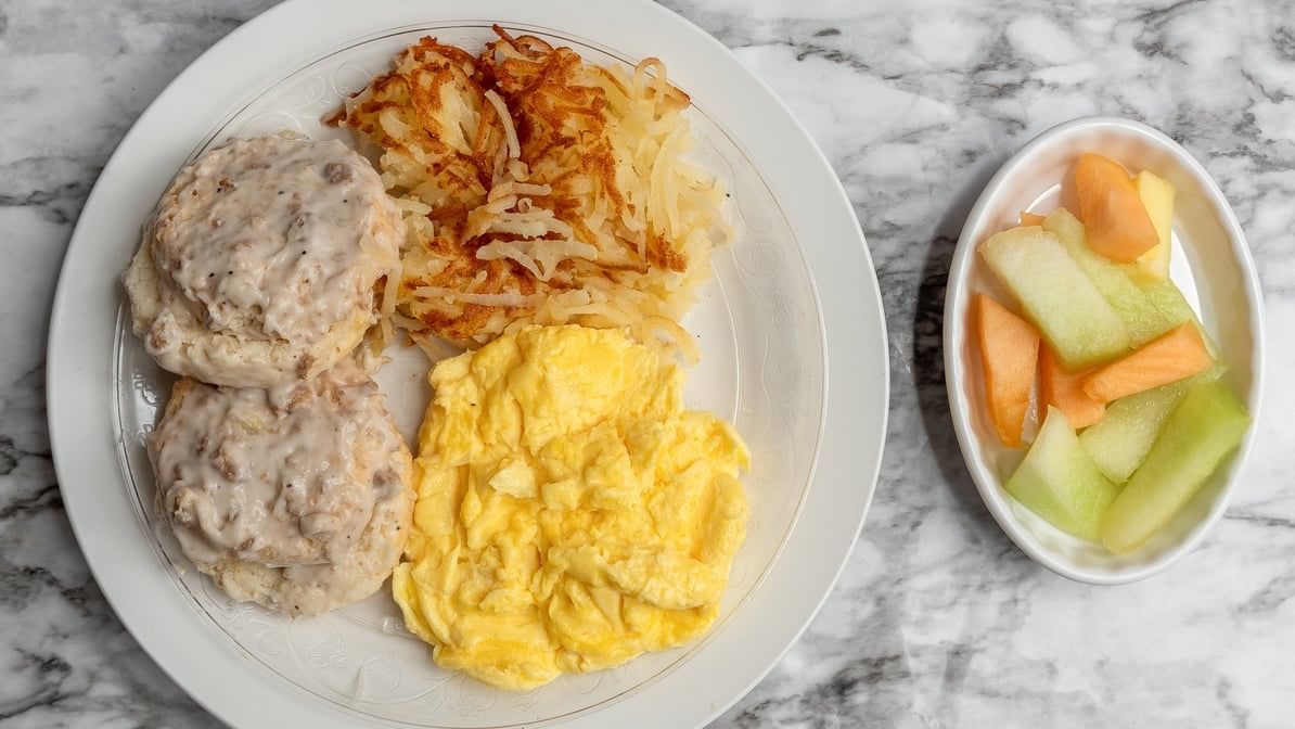 Fresh biscuits and gravy, two eggs, hash browns, fruit