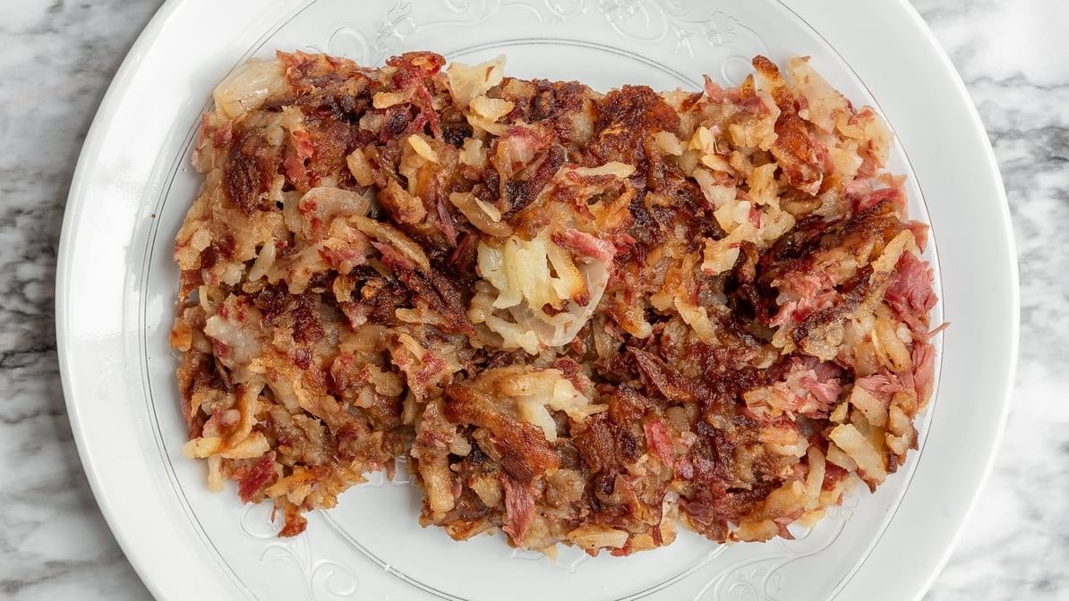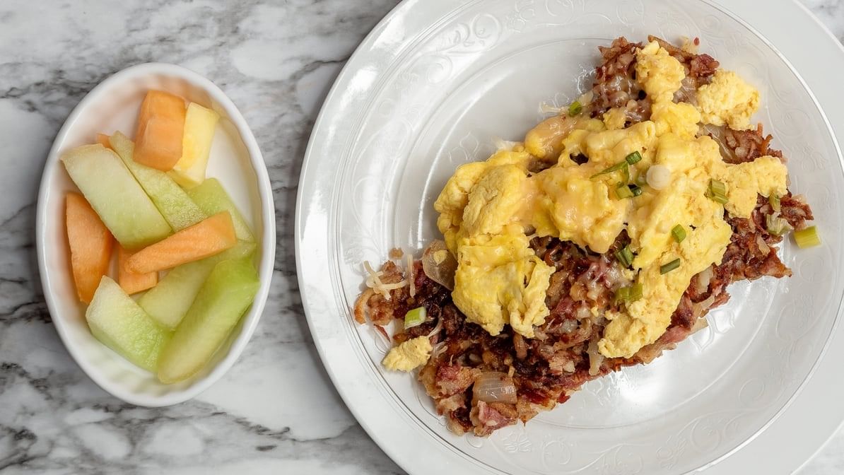 Corned beef hash, scrambled Dijon eggs parmesan, fruit