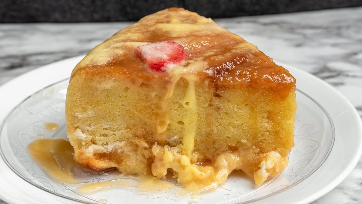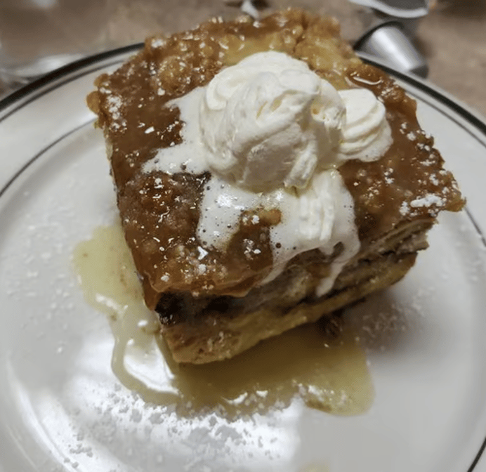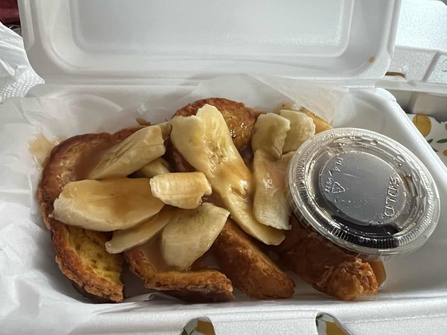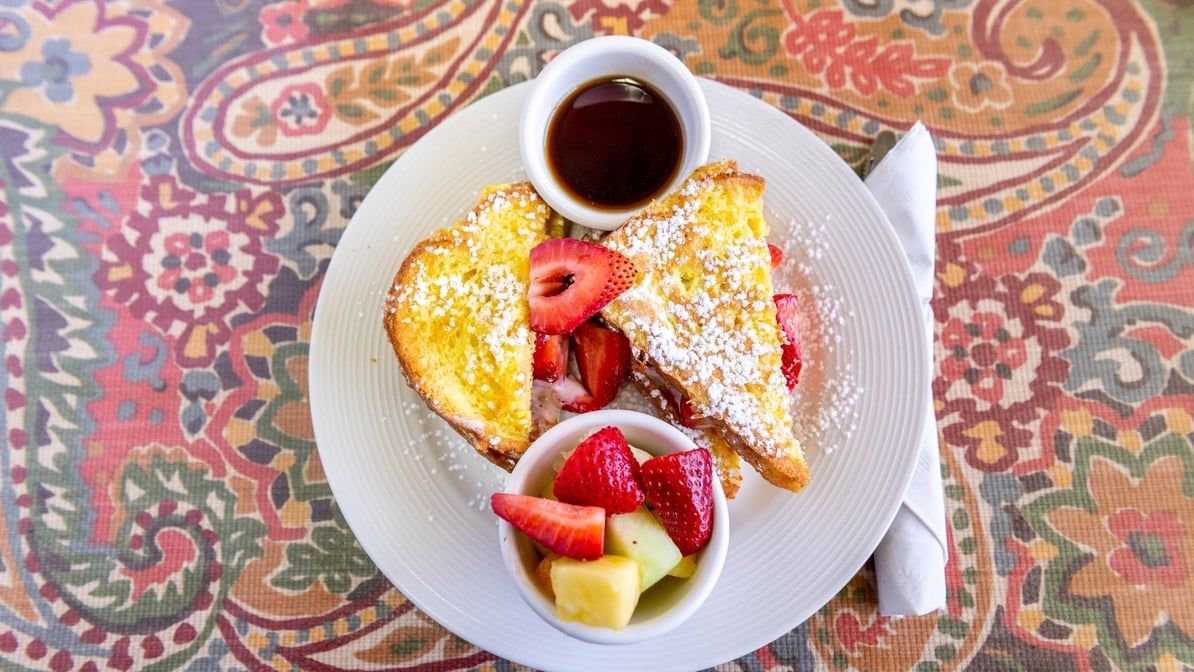 French toast stuffed with strawberry infused cream cheese and fresh strawberries, served with a side of fruit