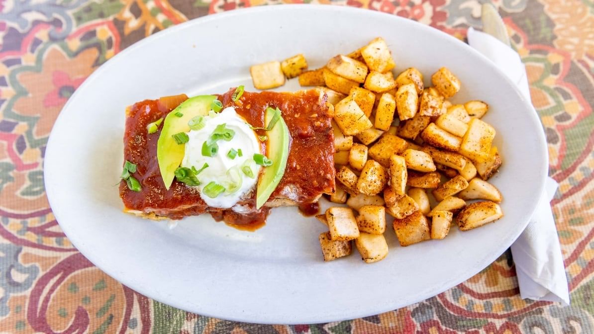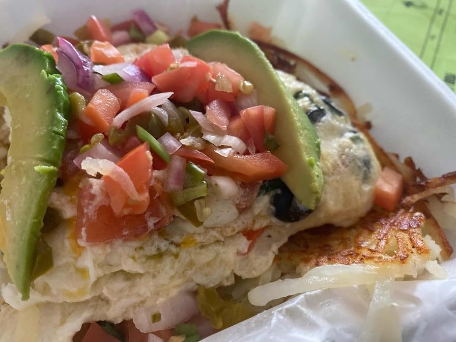 Corn tortillas stuffed with eggs, chorizo, peppers, onions cheddar, topped with ranchero, sour cream, avocado