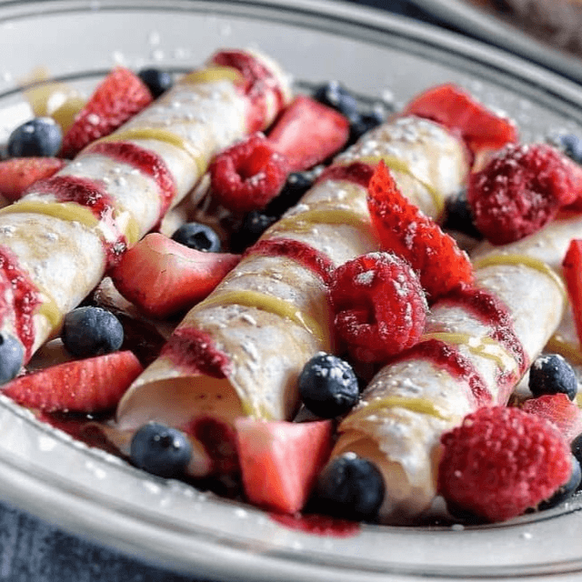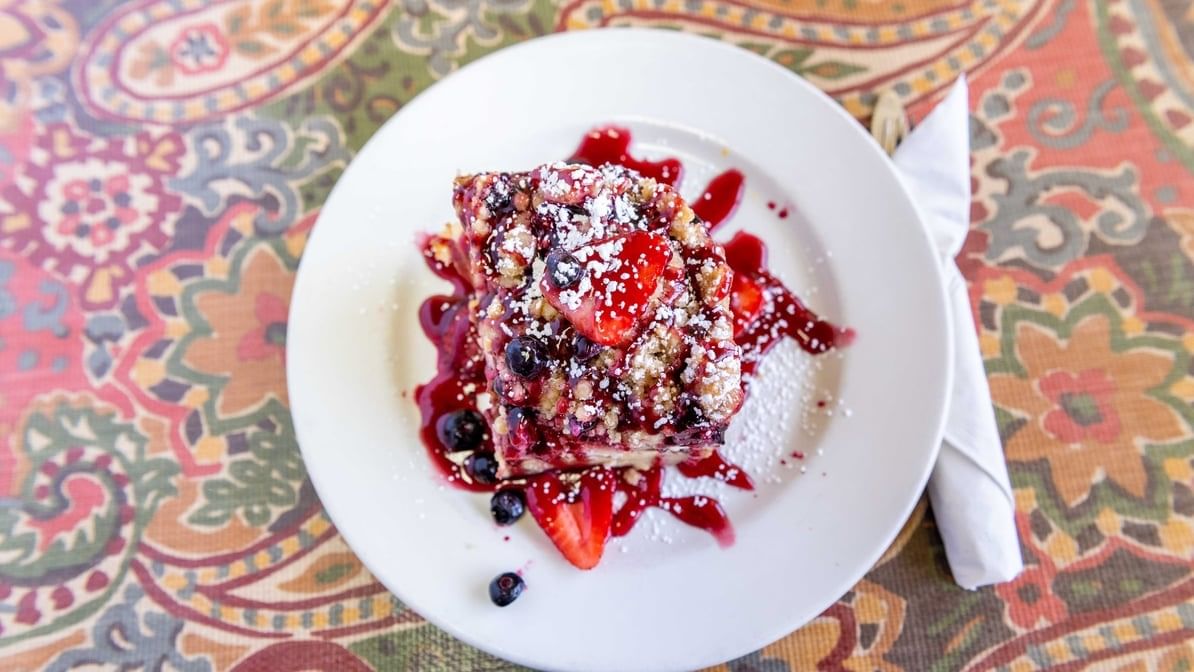 Towering French toast where blueberries, strawberries and the topping