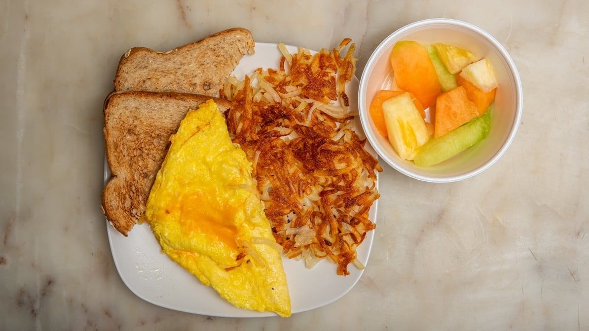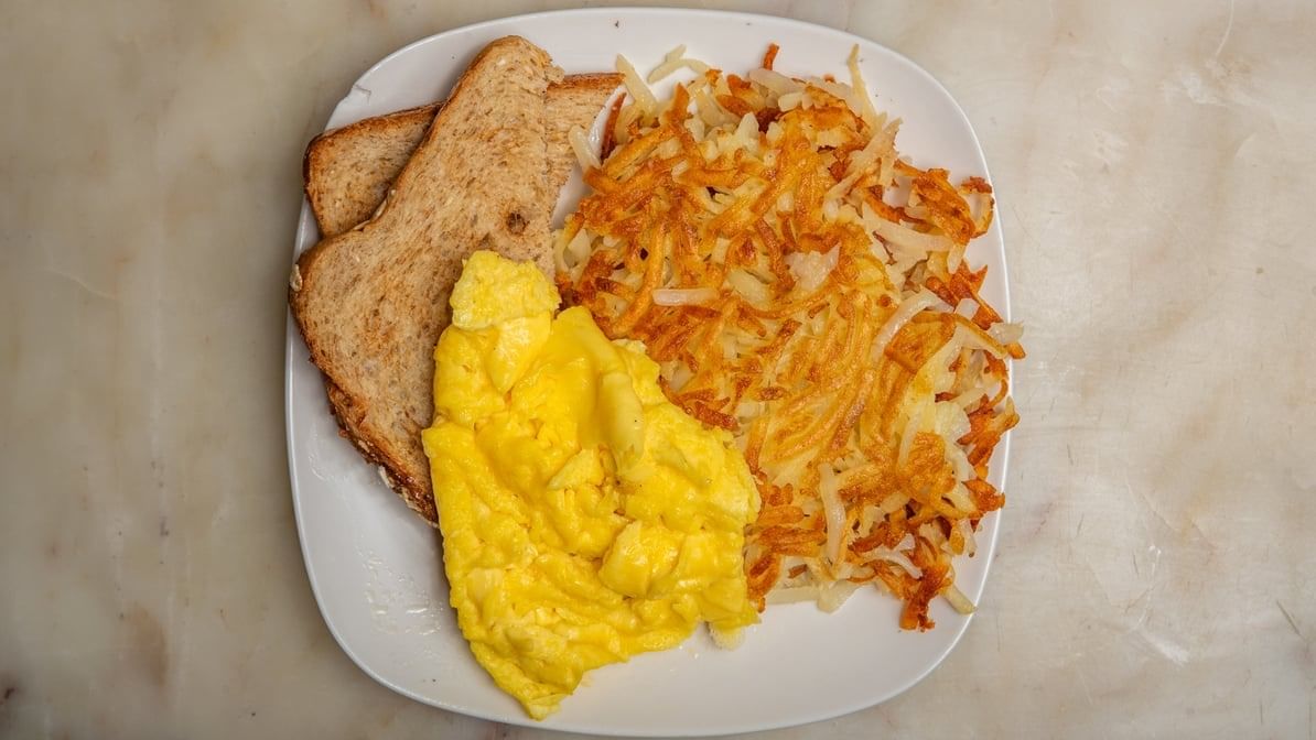 Scrambled over easy, medium, hard, poached or NY with cheddar), side of hash browns toast, fruit