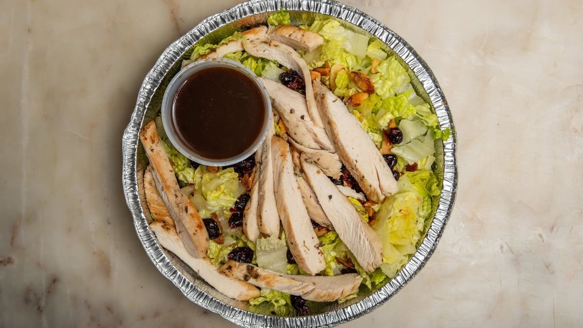 Grilled chicken breast, chopped romaine. Cherries candied almonds, bleu cheese crumbles balsamic vinaigrette