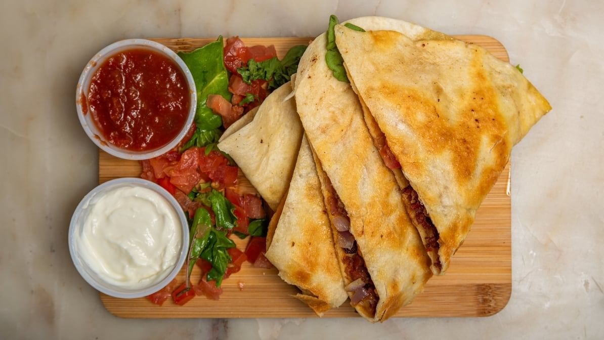 Grilled tortilla stuffed with bacon, tomato, caramelized red onion, arugula, avocado and cheddar