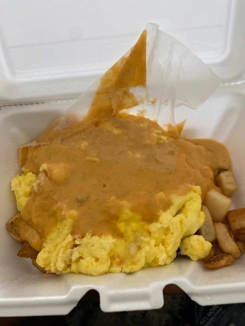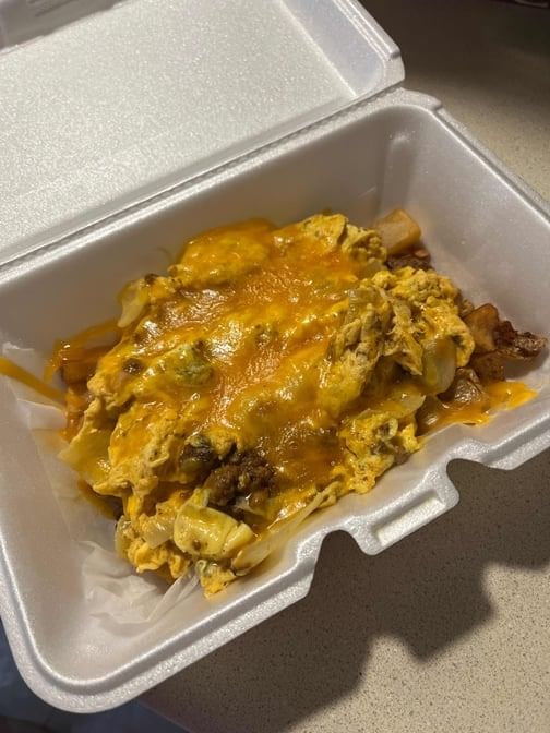 Eggs scrambled with bacon, ham, sausage, cheddar, over diced Potatoes