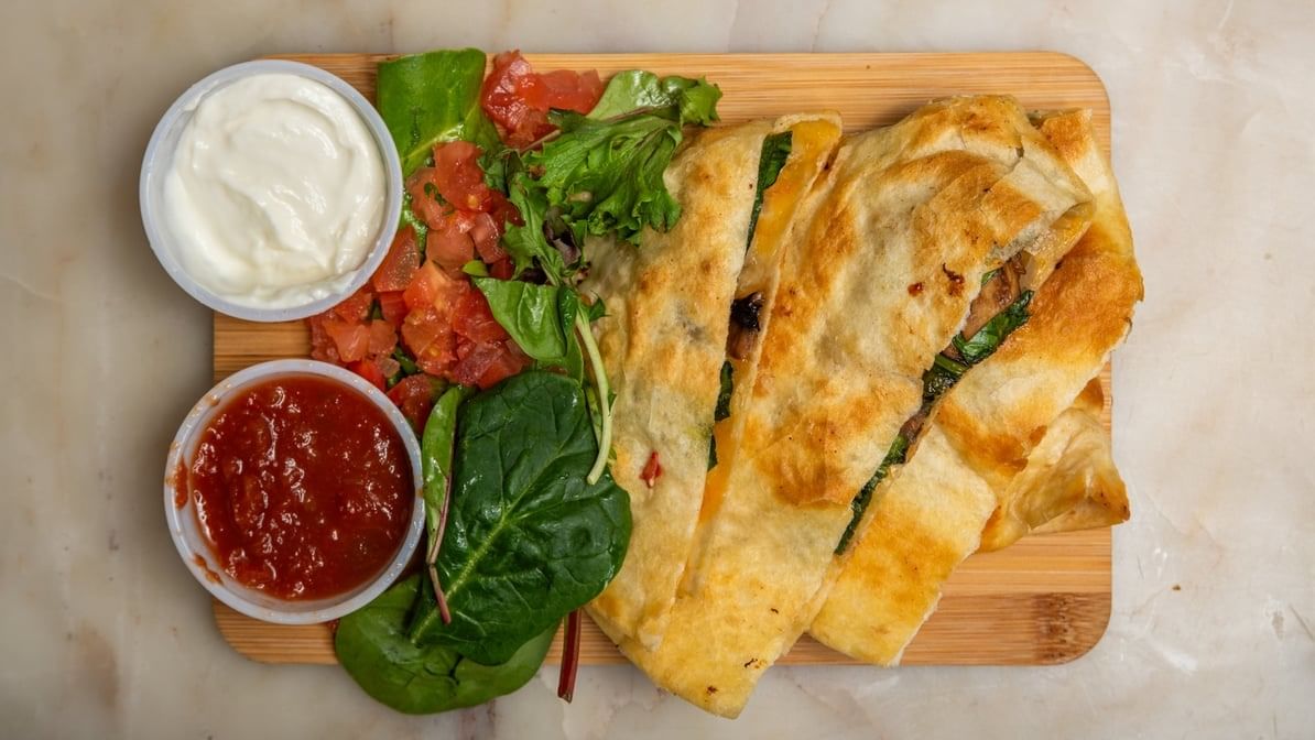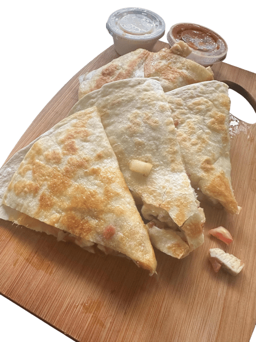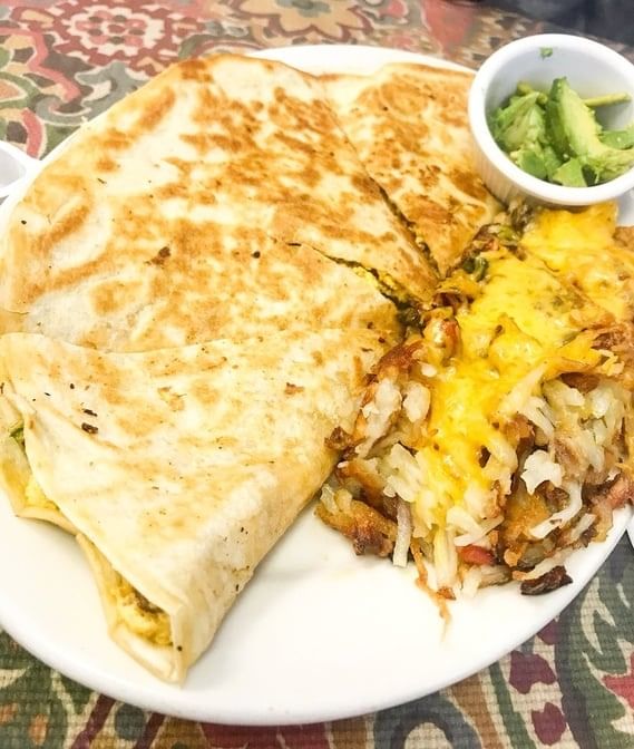 Breakfast quesadilla Egg on chorizo, peppers, onions, and cheese in a grilled flour tortilla served with spicy diced potatoes, house made salsa, sour cream