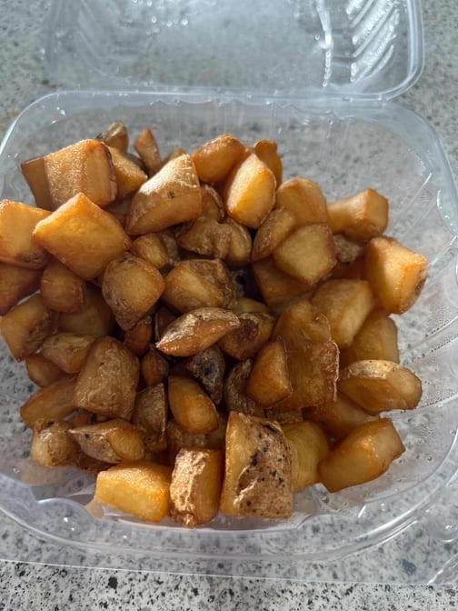 Eggs scrambled with chorizo, cheese, onion, peppers, over diced potatoes