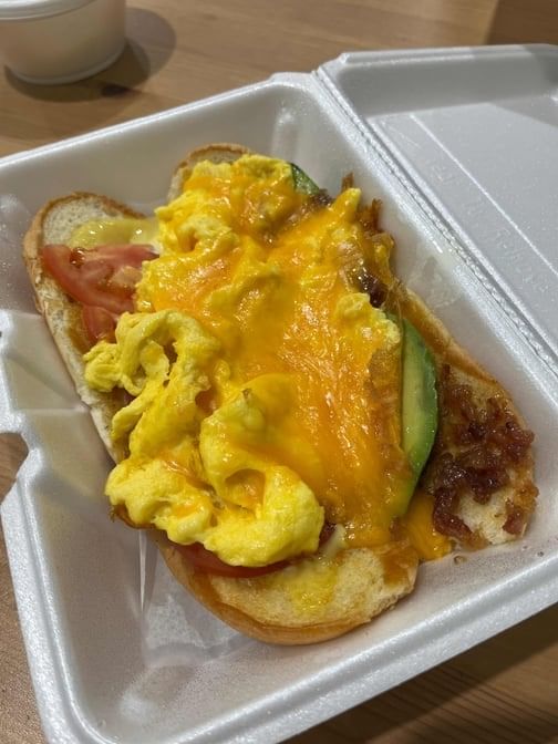 Eggs, avocado, bacon jam, tomato cheddar, whole grain honey mustard on a hoagie