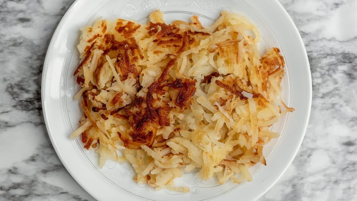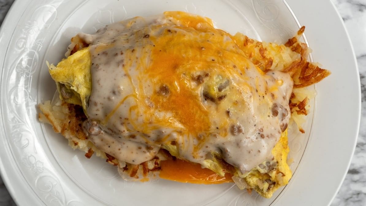 With onion, cheddar, hash browns, sausage gravy