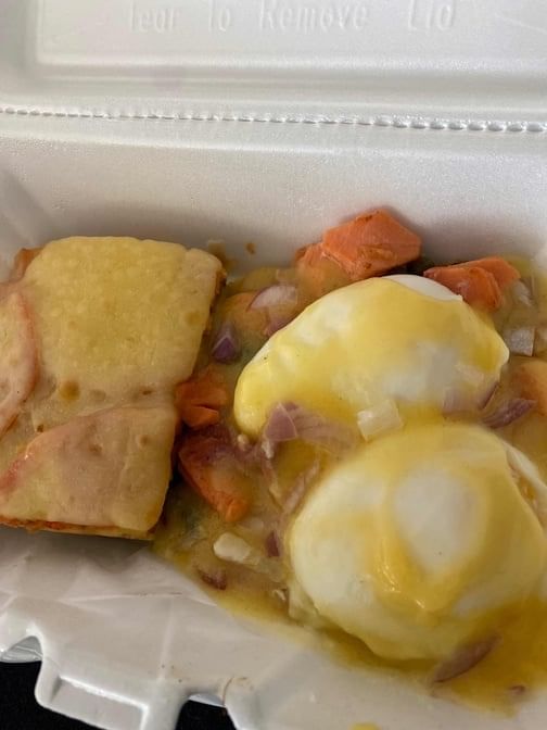 Capers, onion, poached eggs topped with Hollandaise