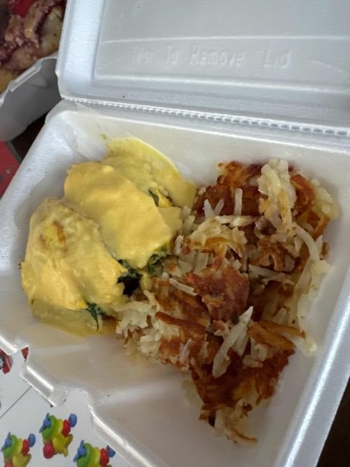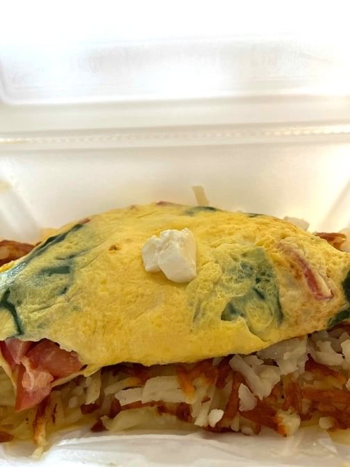 Eggs scrambled with fresh spinach, artichokes tomatoes, feta, over diced potatoes