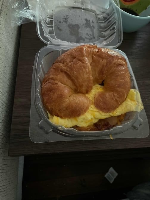 Croissant with scrambled eggs, cheddar, bacon