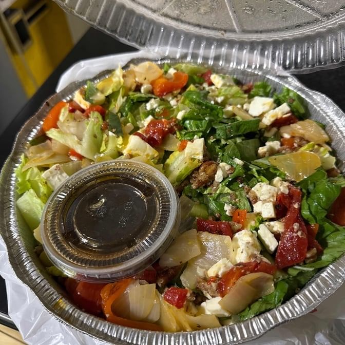 Romaine, grilled onions and red peppers, pecans. Feta, balsamic vinaigrette
